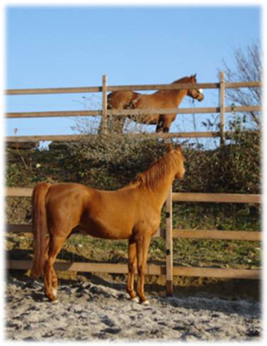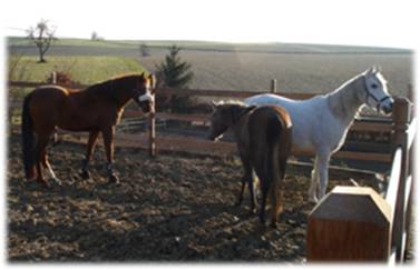 Gaziella (Schimmel, rechts): „Kann ja sein – aber ich interessiere mich mehr für das Original. Von hier oben hat man einen besseren Blick auf ihn als von unserem Paddock aus.“