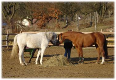 Mimmi (Grauschimmel, Mitte): „Komisch - diese Neue sieht irgendwie aus wie unser Chef!“